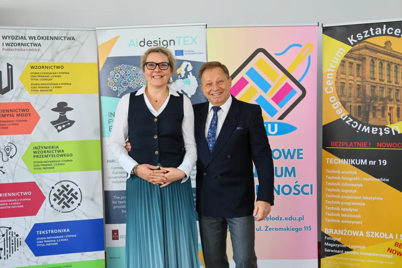 Na zdjęciu: dr hab. inż. Agnieszka Cichocka – Wydział Włókiennictwa i Wzornictwa PŁ oraz Ireneusz Chabrowski – Prezes Stowarzyszenia Włókienników Polskich SWP.
