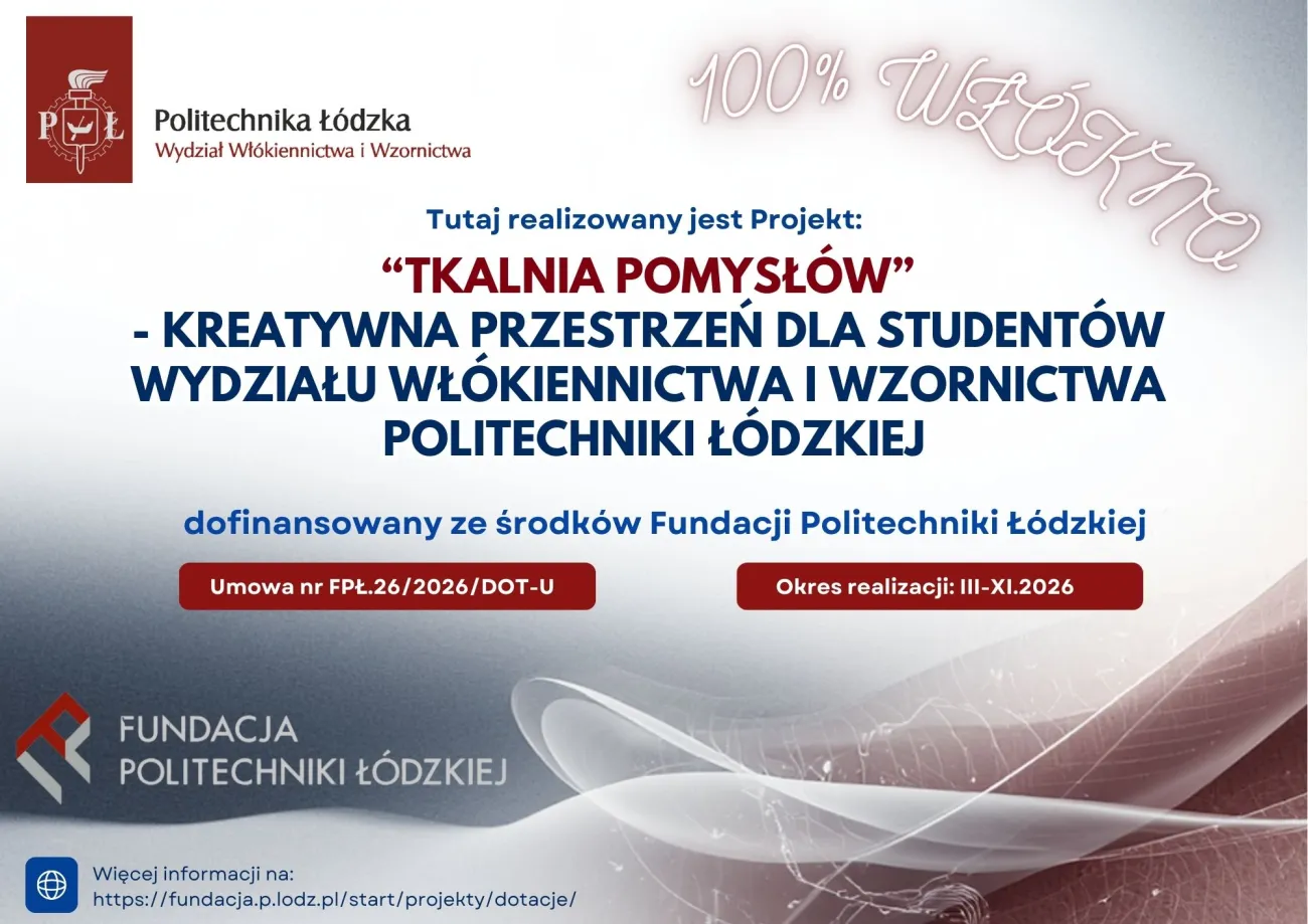 W 2026 roku na Wydziale Włókiennictwa i Wzornictwa Politechniki Łódzkiej będzie realizowany projekt „Tkalnia Pomysłów” – kreatywna przestrzeń dla studentów Wydziału Włókiennictwa i Wzornictwa PŁ, dofinansowany ze środków Fundacji Politechniki Łódzkiej.
